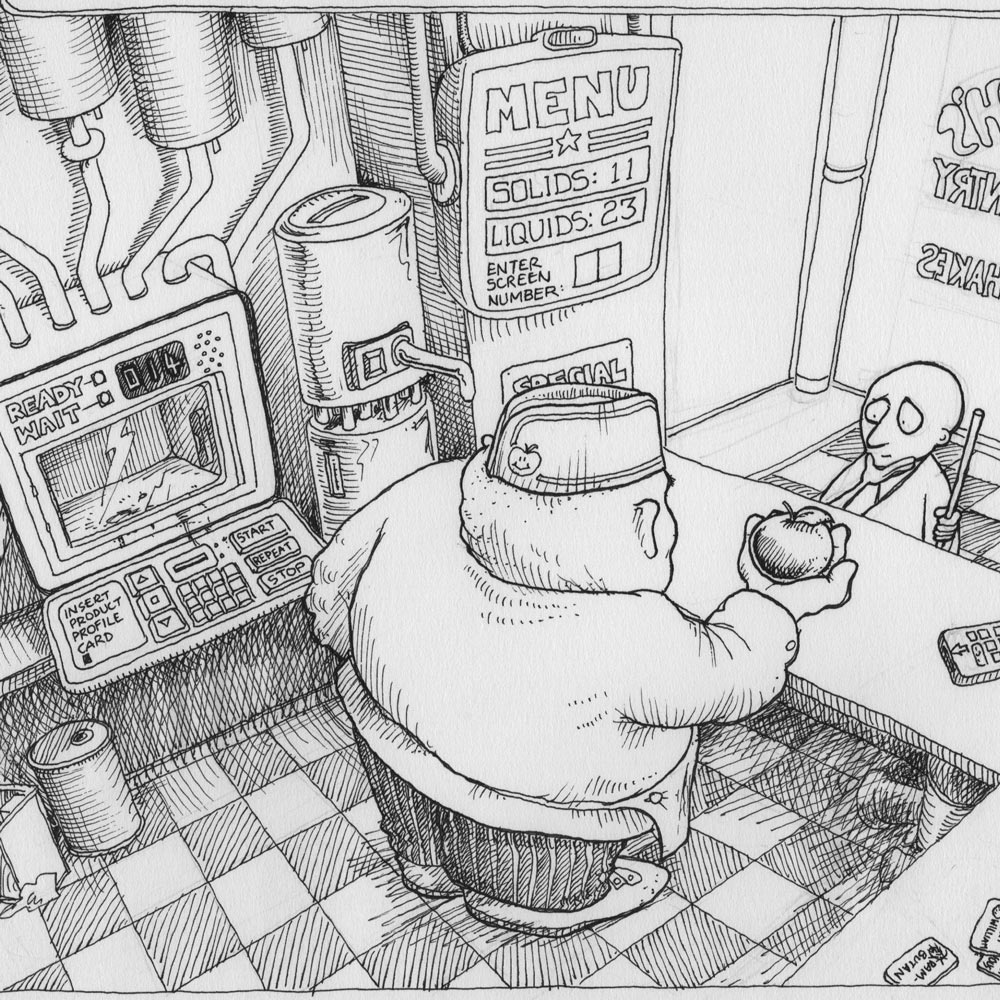 Another illustration from one of several pages for Book of Pages that never made it into the final story (drawn sometime around 1991). This one is “Fabricating Food for Thought”, and some of the ideas here ended up in “Fast Food” (p.14 of the final book) instead. This is an unfinished drawing: the scene beyond the glass behind Jiriki is missing. This happened where I wanted to reference the scene from the pages immediately before or after the one I was illustrating, but I wasn’t sure which pages those were because the final order would depend on (as well as other things) how the illustrations looked next to each other. Such is the inevitable chicken-and-eggness of working on projects that are as deeply intertwingled as Book of Pages was.