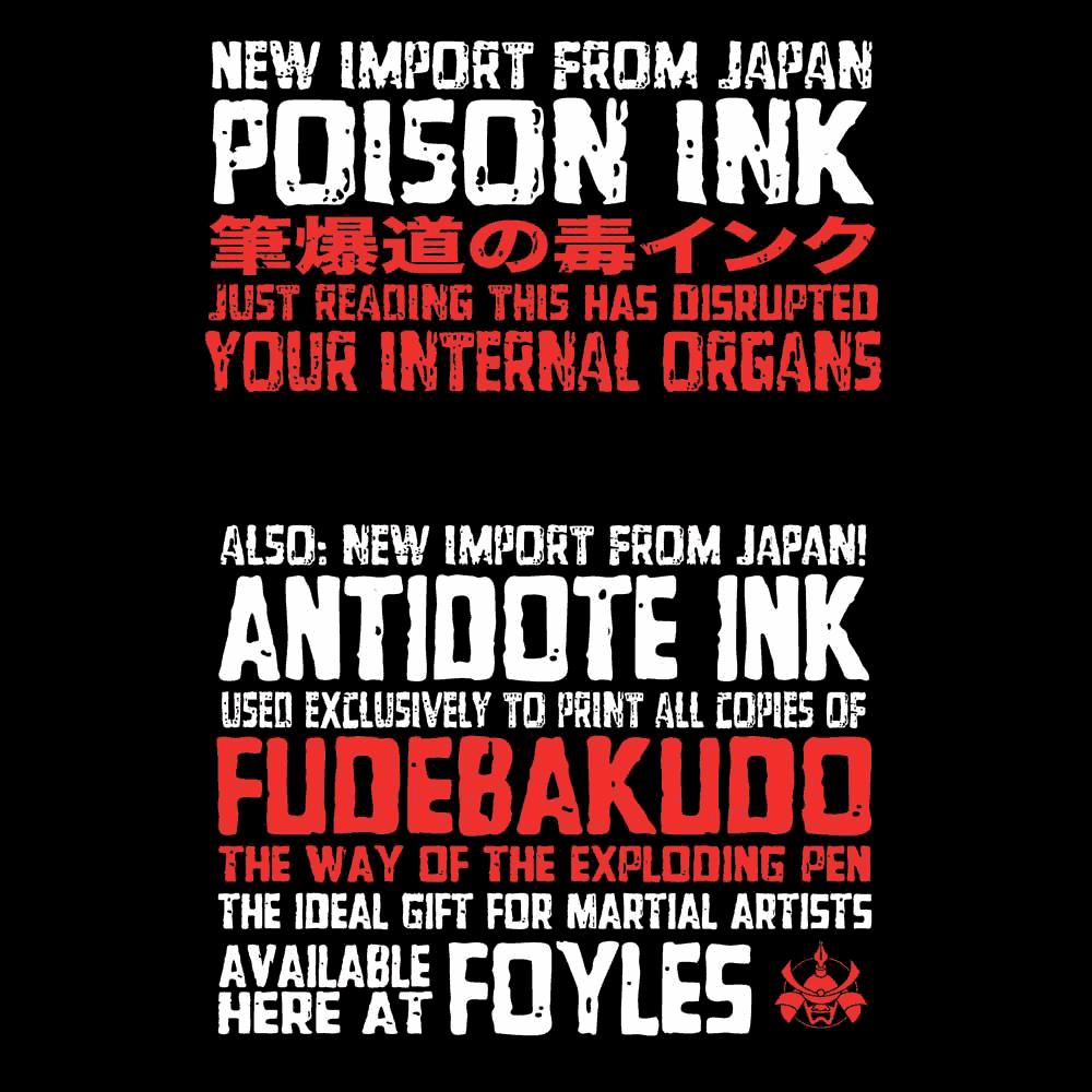 Foyles is the grand-daddy of independent bookshops and was a hugely positive part of the Fudebakudo book’s timeline. The Foyles people were the champion sellers for Fudebakudo the year after it launched (becoming, I was told, the best-selling title in the Sports Section in 2004 at Christmas — a claim that narrows in its telling, I know, but still a good one to have). They always were charmingly chaotic and back in the day the martial arts section of their famous shop on Charing Cross Road was the biggest and best in London (maybe that doesn’t count for much because it’s such a small market; on the other hand, if you want to sell books in bulk you end up like WHSmith, or Tescos and have no business appealing to niches). Furthermore — and crucially for a small publisher like Exploding Pen — back in 2003 the staff on the floor, who knew and understood the books and the shelves and the public that could be found in their specific departments — had the autonomy to make their own purchasing decisions, rather than floating them up to some distant head office pooh-bar, as was the wearisome case with most other booksellers. Since those times Foyles has expanded and they’ve lost their way a bit and along with it much (but not quite all) of their charm. Nonetheless, independent bookshops are to be treasured, so although it’s been many years since I was putting posters up on their walls, when I’m in London I try to drop in, to check they’re keeping the unsold copies of Fudebakudo nicely dusted, and to acknowledge their still well-meant greeting, the one that proclaims in neat, suspiciously-corporate lettering, “Welcome book lover, you are among friends”, and which I must duck under in order to get to that most overlooked and undervisited of shelves.
